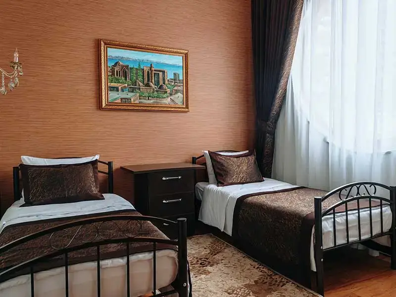 Soft lighting, soothing tones, and elegant details create a cozy atmosphere where everyone can relax and unwind. Whether you’re planning a long stay or a weekend escape, this suite offers the perfect blend of space, privacy, and boutique charm — just moments from the Caspian coastline.