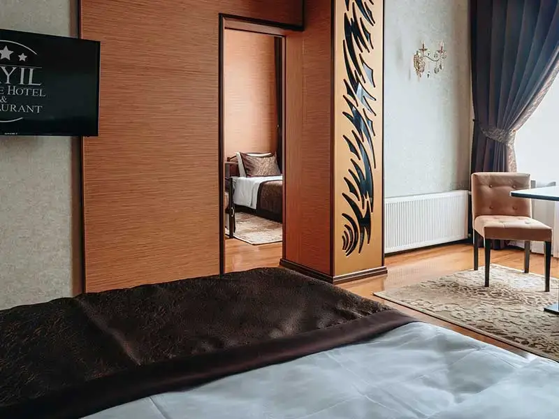 The Family Suite at Bayil Breeze Boutique Hotel is designed for togetherness without compromise on comfort. With 45 m² of space and two separate bedrooms, it offers an ideal setup for families or friends traveling together. One room features a king-size bed for restful nights, while the adjoining room includes two twin beds for added flexibility.